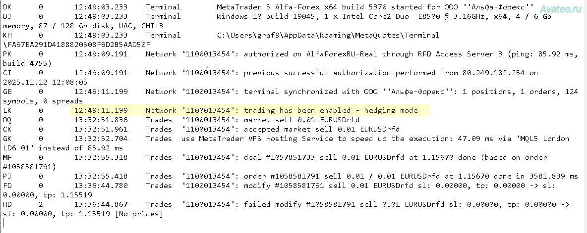 То есть брокер отказался открывать мне Sell на пике дневного диапазхона торговли, а открыл лишь внизу. Я скчал лог и тут впал в поный ступор- там не было никакой информации, все качественно подчищенно!!