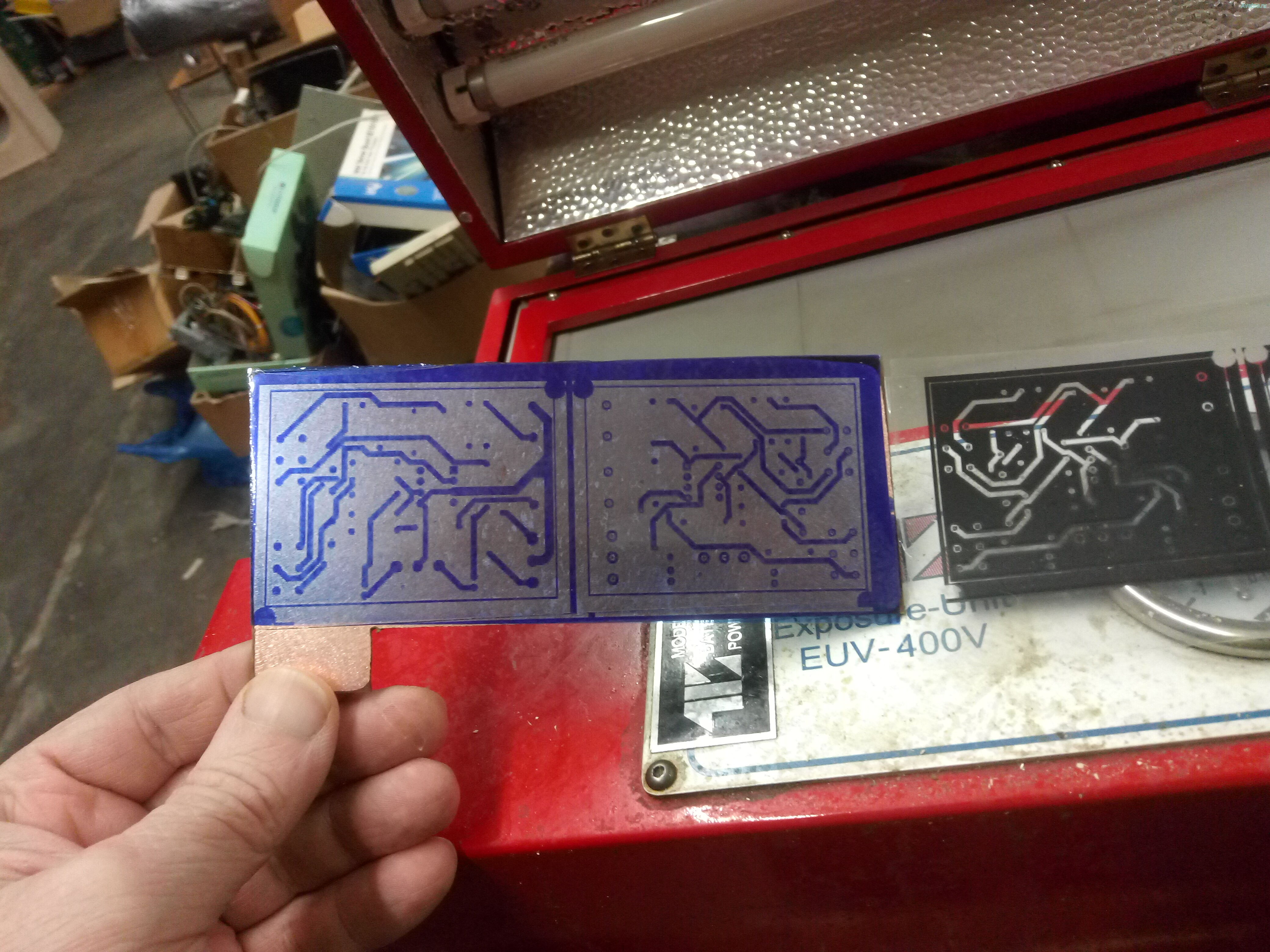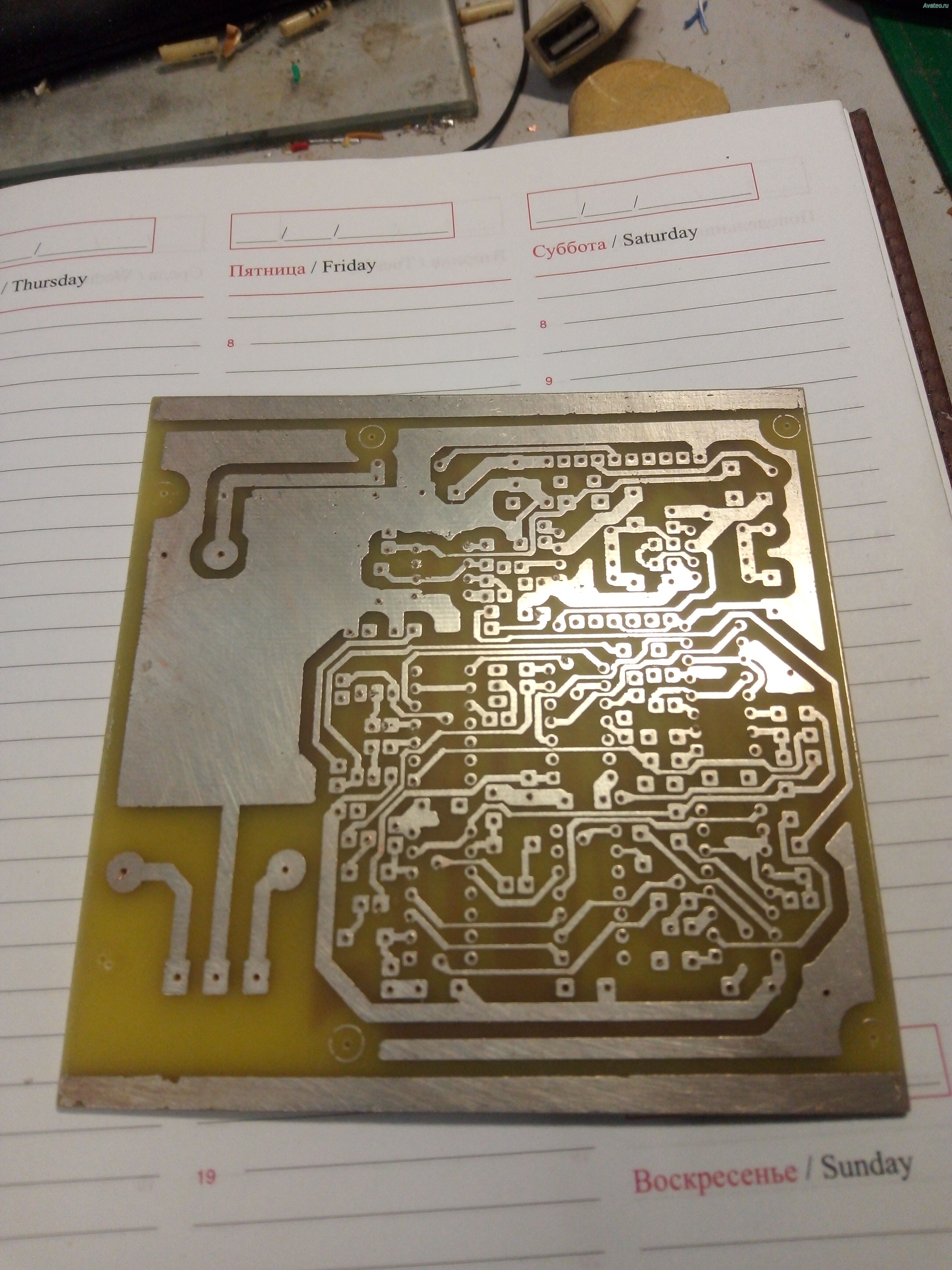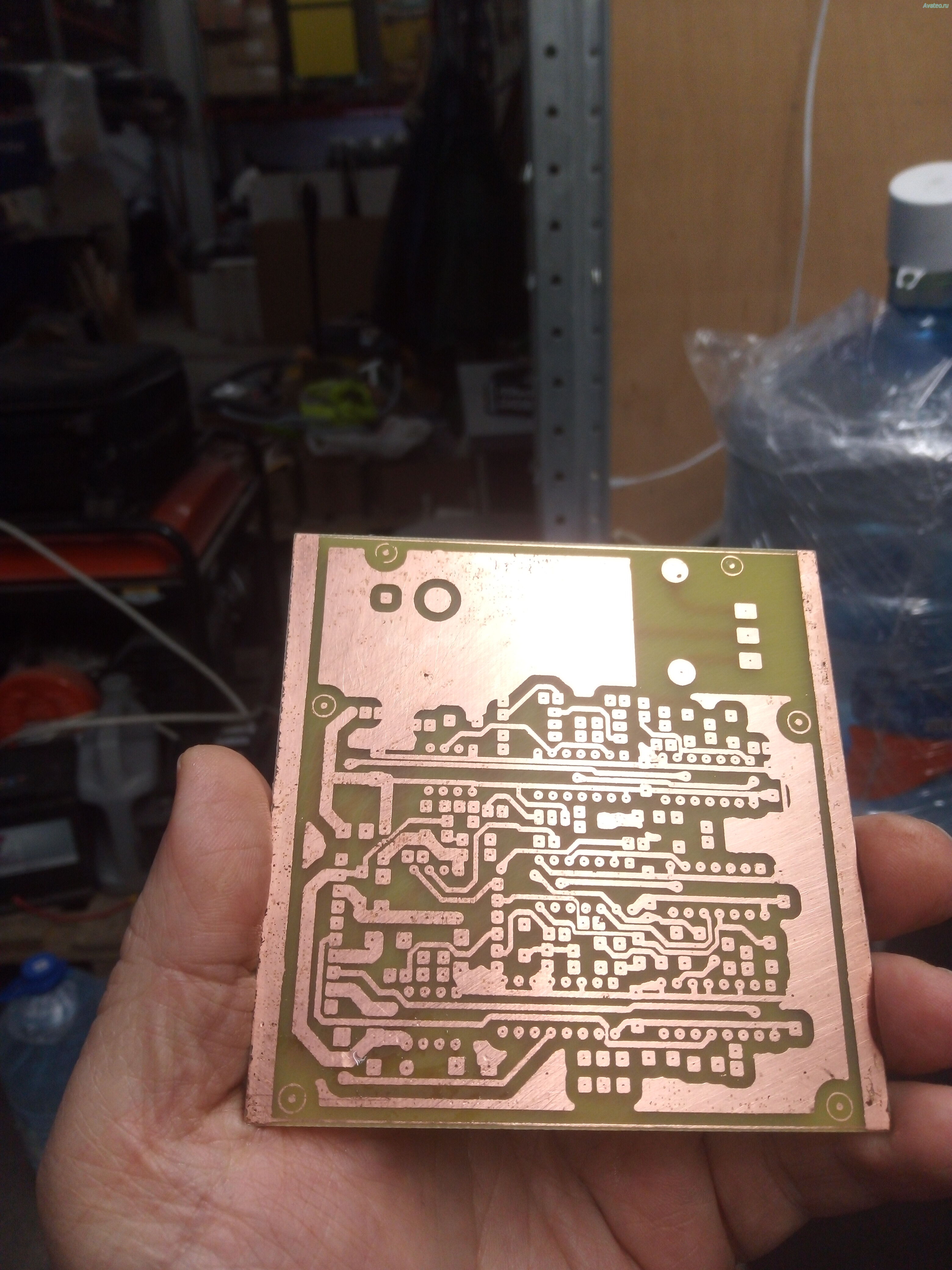 Часть рисунка не проявилась, местами резист размылся не полностью: Это может означать, что вы недостаточно перемешивали раствор при проявке или концентрация щёлочи была слабовата. Или же засветка была неравномерной (например, лампа слишком далеко, по краям платы не досветило). Решение: аккуратно дочистить проблемные места кисточкой в проявителе. Проверить равномерность засветки – может, имеет смысл зеркалами или фольгой сделать отражатели вокруг лампы. Концентрацию проявителя можно слегка увеличить (но осторожно, чтобы не переесть резист).